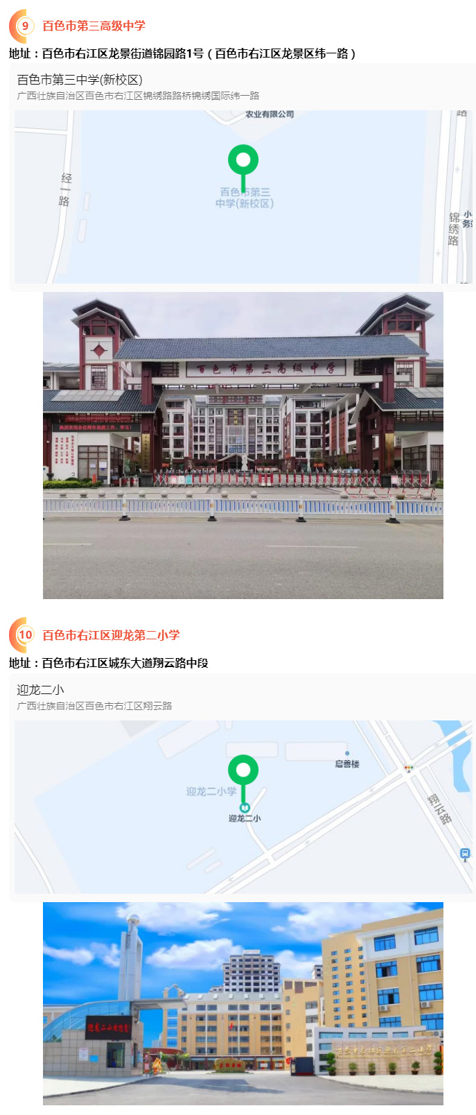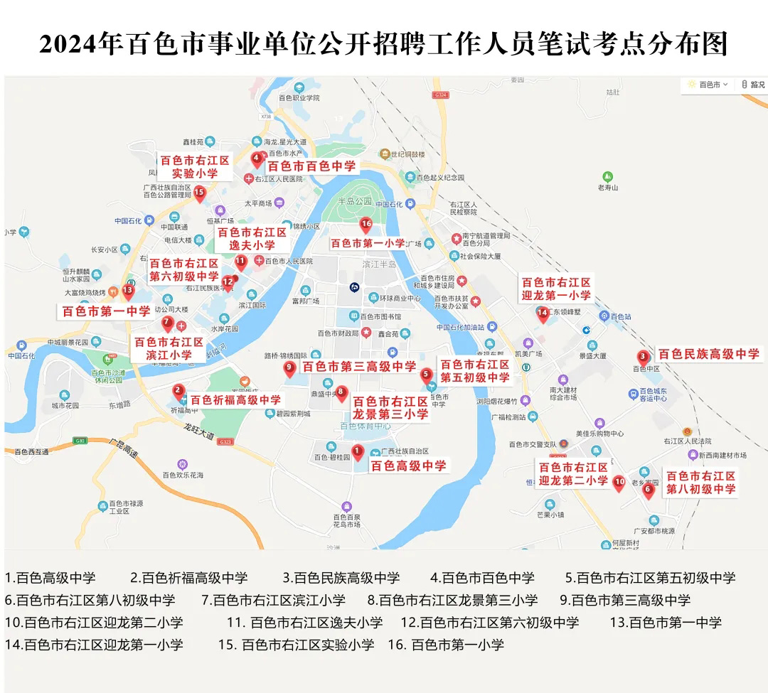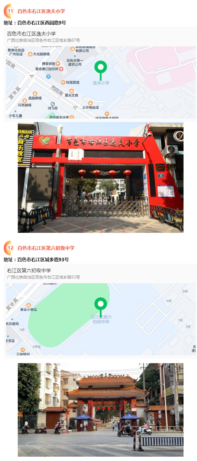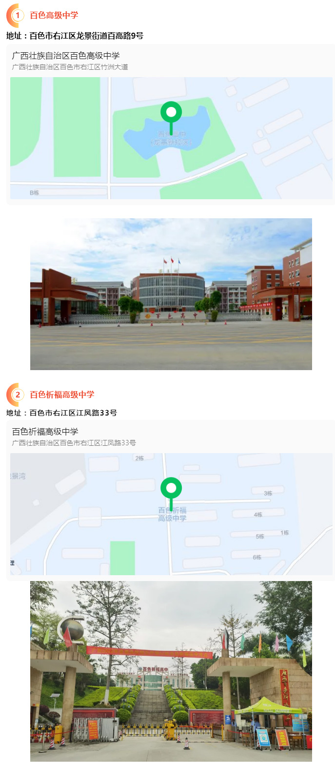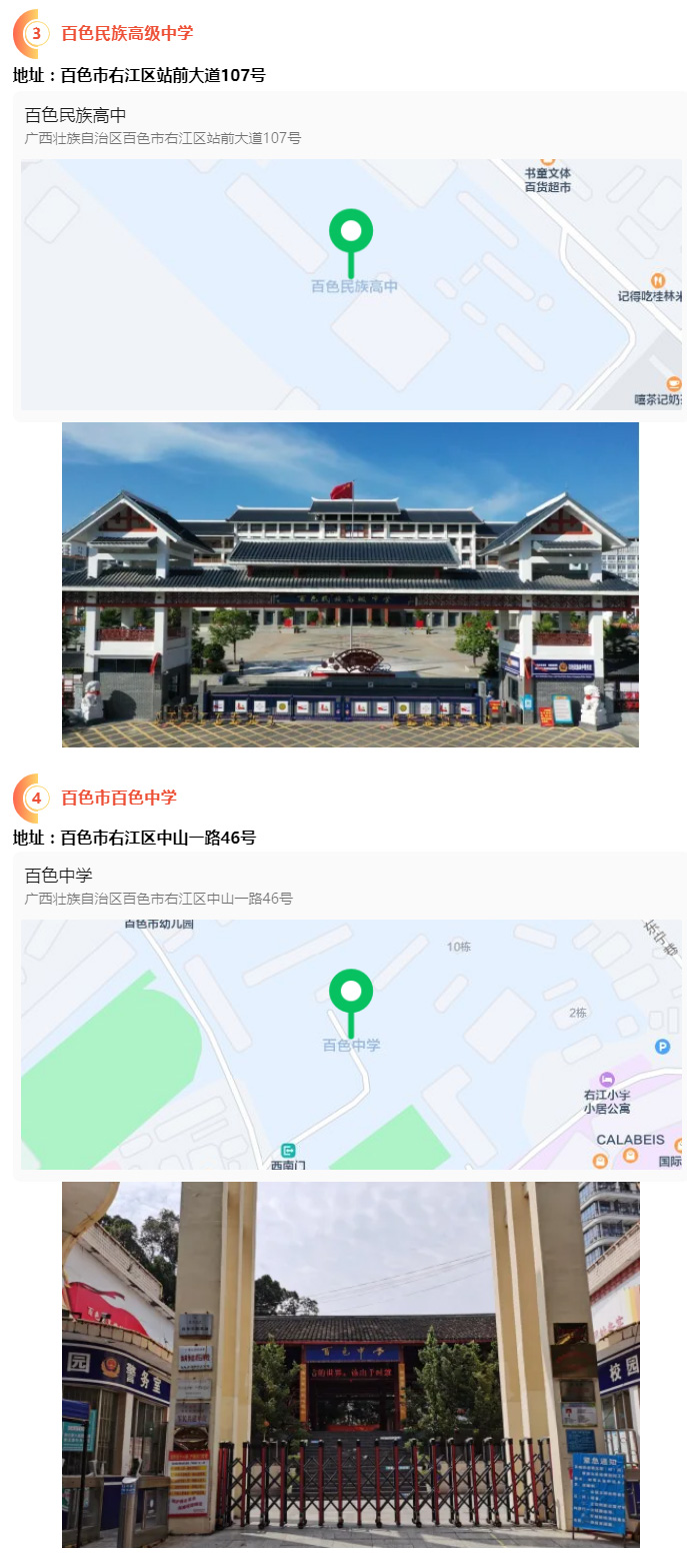 2.請?zhí)崆笆煜た键c地址,做好路線、住宿的安排。本次考試參考人數較多,考點分布分散,建議考生考前實地察看考點,確認考點入口位置,防止走錯考點。請充分考慮考點周邊交通通行情況和停車場地容量,合理安排出行方式,預留充足時間,確保考試當天按時到達。另外,考試期間百色市及各考點學校周邊的住宿比較緊張,請?zhí)崆邦A定。