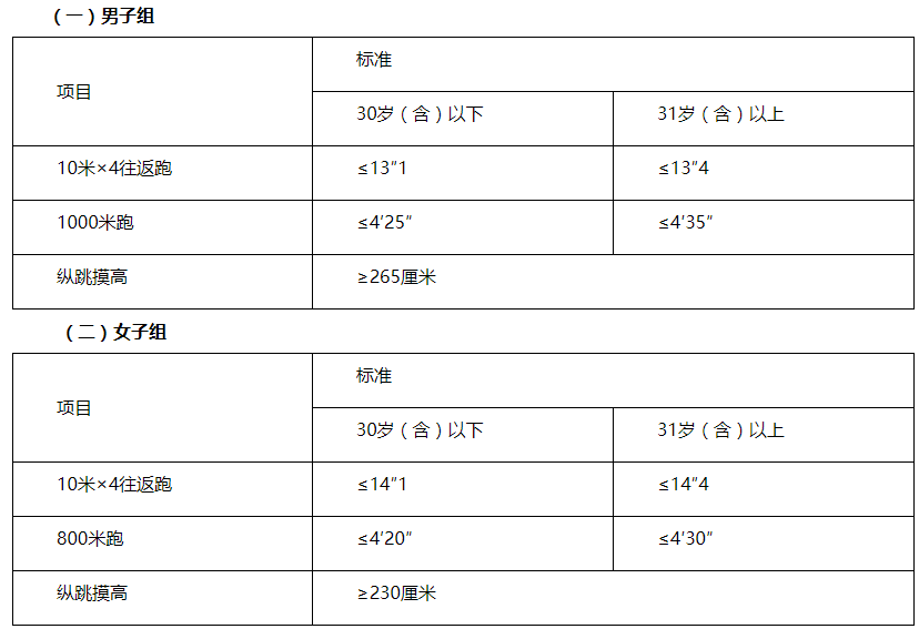 體能測評三項全部達標(biāo)方為合格。體能測評項目中,縱跳摸高的測試次數(shù)不超過3次,10米×4往返跑的測試次數(shù)不超過2次,長跑項目(男子1000米、女子800米)的測試次數(shù)為1次。