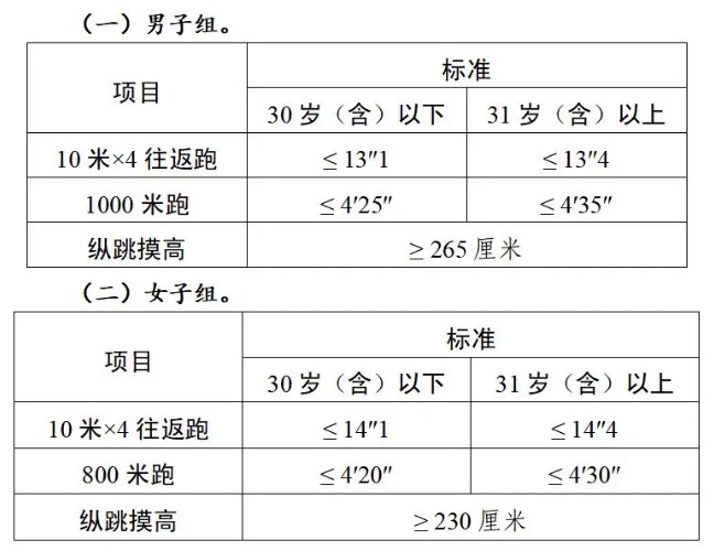 體能測(cè)評(píng)三項(xiàng)全部達(dá)標(biāo)方為合格。報(bào)考緊缺職位的人員,體能測(cè)評(píng)三項(xiàng)中有二項(xiàng)達(dá)標(biāo)的,視為合格。其中:縱跳摸高的測(cè)試次數(shù)不超過(guò)3次,10米×4往返跑的測(cè)試次數(shù)不超過(guò)2次,1000米跑/800米跑的測(cè)評(píng)次數(shù)為1次。
