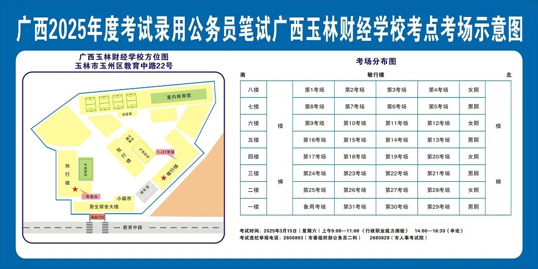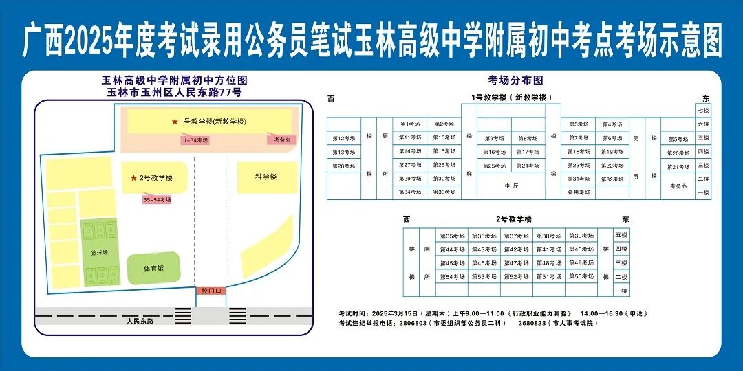 請(qǐng)及時(shí)登錄“廣西人事考試網(wǎng)”打印筆試準(zhǔn)考證并妥善保管,仔細(xì)查看準(zhǔn)考證上的考點(diǎn)信息。本次考試玉林市考區(qū)共設(shè)11個(gè)考點(diǎn),各考點(diǎn)名稱及地址如下: