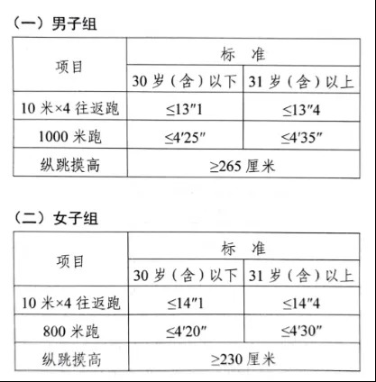 參照《公安機(jī)關(guān)錄用人民警察體能測評項目和標(biāo)準(zhǔn)》的項目及測試規(guī)則開展體能測評,本次體能測評的項目和標(biāo)準(zhǔn)如下: