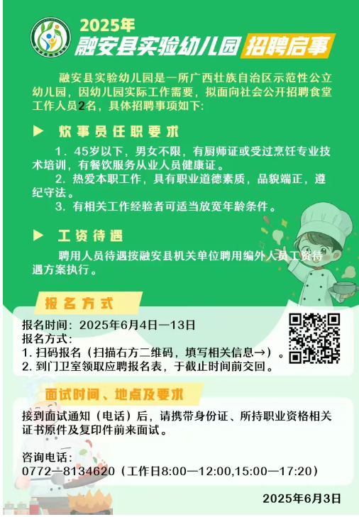 2025年柳州融安縣實(shí)驗(yàn)幼兒園炊事員招聘2人