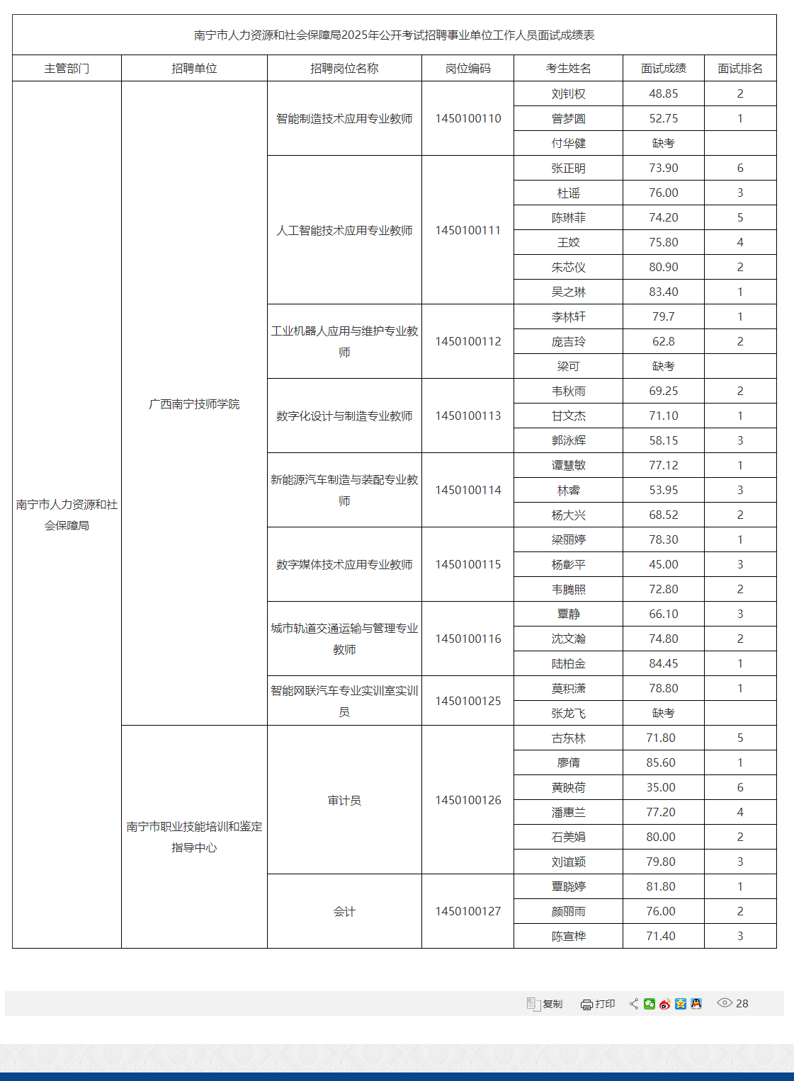 南寧市人力資源和社會保障局2025年公開考試招聘事業(yè)單位工作人員面試成績表