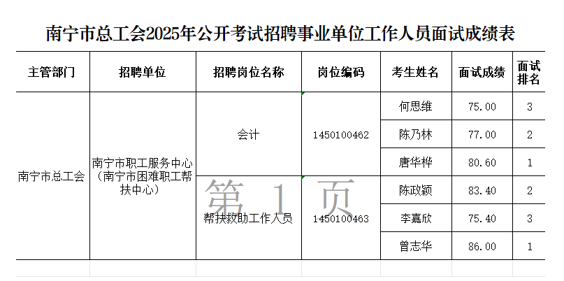 原文標(biāo)題:南寧市總工會(huì)2025年公開(kāi)考試招聘事業(yè)單位工作人員面試成績(jī)表