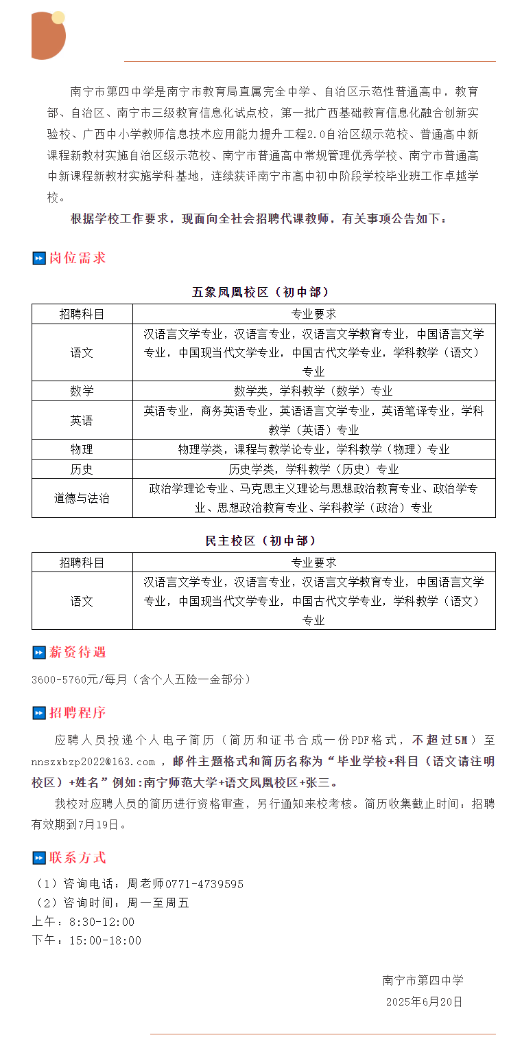 原文標題:南寧市第四中學2025年代課教師招聘公告