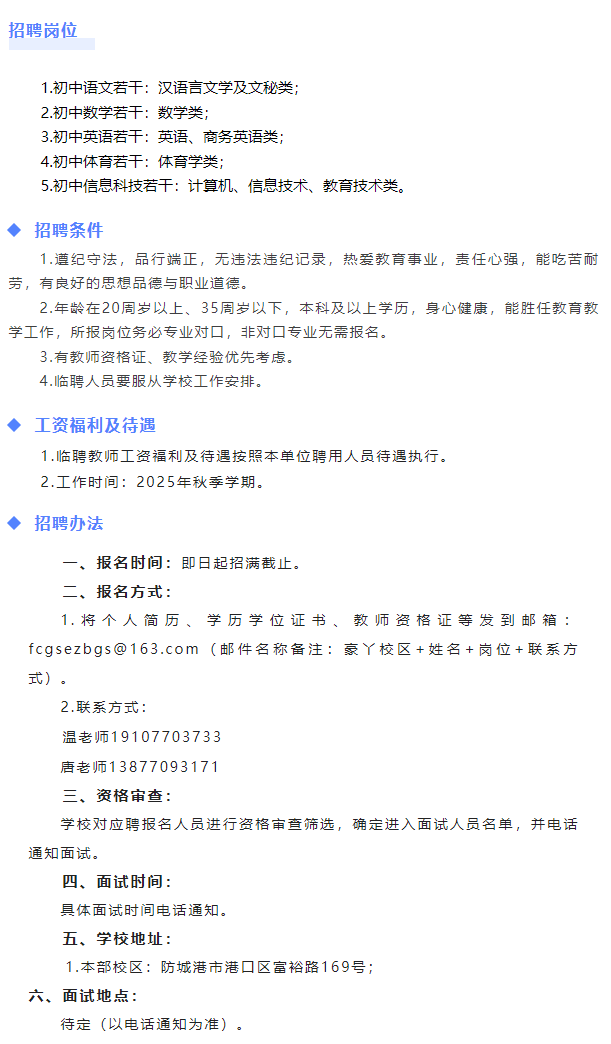 原文標題:防城港市第二中學(xué)(豪丫校區(qū))2025年秋季學(xué)期臨聘教師招聘公告