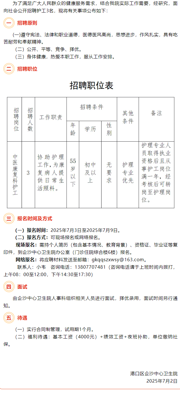 2025年港口區(qū)企沙中心衛(wèi)生院招聘護工(第二批)公告