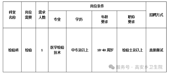 來賓市興賓區(qū)高安鄉(xiāng)衛(wèi)生院是一家集醫(yī)療、預(yù)防保健、康復(fù)醫(yī)療于一體的國家公立基層醫(yī)療機(jī)構(gòu),現(xiàn)有職工45人,服務(wù)人口約2萬人。因工作需要,我院擬向社會(huì)公開招聘編制限額外檢驗(yàn)科人員1名,現(xiàn)將有關(guān)招聘事項(xiàng)公告如下: