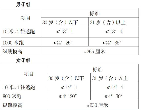2.體測項目和標準。參照《關于印發(fā)公安機關錄用人民警察體能測評項目和標準(暫行)的通知》(人社部發(fā)〔2011〕48號)的項目及測試規(guī)則,結合《公安民警體育鍛煉達標手冊》成績標準,本次體能測評的項目和標準如下: