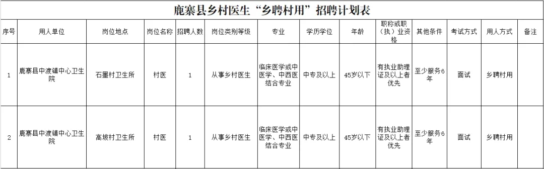 因工作需要,我院擬向社會公開招聘鄉(xiāng)村醫(yī)生2名,現(xiàn)將有關(guān)招聘事項公告如下: