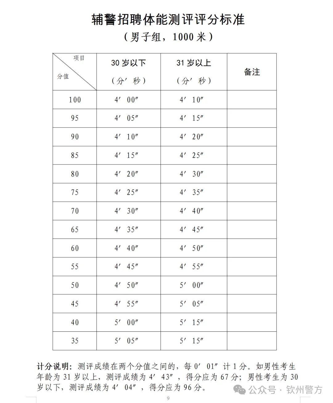 1.體能測試。資格審查合格的考生參加體能測試。體能測試項(xiàng)目為長跑,即男子1000米,體能測試計(jì)算成績,評分標(biāo)準(zhǔn)附后。