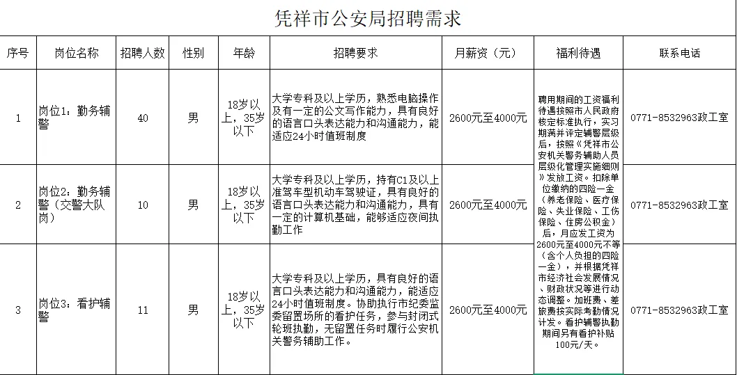 (二) 報(bào)名地點(diǎn)憑祥市公安局(憑祥市北大路69號(hào))報(bào)名及咨詢電話:0771-8532963報(bào)名投簡(jiǎn)歷郵箱:pxgazgs@163.com報(bào)名請(qǐng)附上身份證復(fù)印件、學(xué)歷畢業(yè)證書復(fù)印件