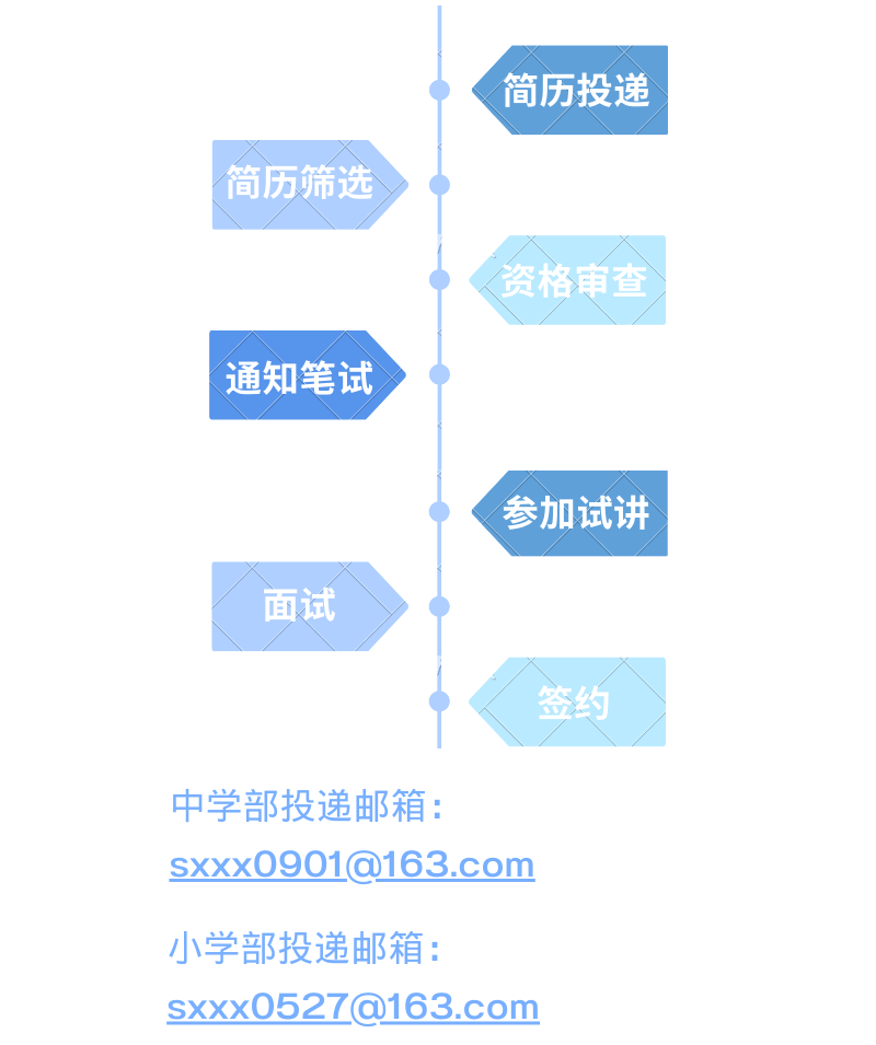 請將個人簡歷(Word或PDF版本)、一張個人生活照以電子郵件附件形式發(fā)送至報名崗位對應(yīng)的郵箱(如有作品,請將作品集一起發(fā)送到報名郵箱),郵件主題和附件文件名請備注:應(yīng)聘學科+姓名+畢業(yè)學校。
