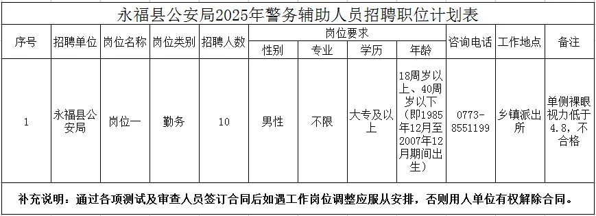 對(duì)確定聘用的警務(wù)輔助人員與永福縣公安局簽訂勞動(dòng)合同(合同期三年,試用期六個(gè)月,試用期滿經(jīng)考核不適合崗位工作的,解除聘用合同),從事警務(wù)輔助工作。警務(wù)輔助人員依法履行輔助性工作職責(zé),由公安機(jī)關(guān)管理使用、不具有人民警察身份,在公安機(jī)關(guān)及其人民警察的指揮和監(jiān)督下開(kāi)展輔助性工作。
