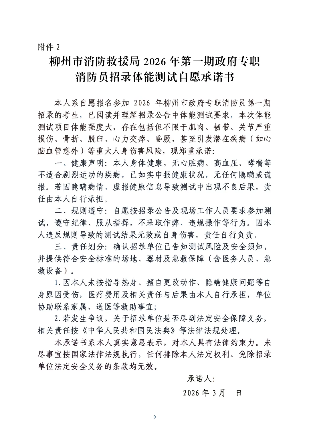 考生在體能測(cè)評(píng)前需簽署體能柳州市政府專職消防員第一期招錄體能測(cè)試承諾書,拒絕簽署的不予進(jìn)行考核詳見(jiàn)(附件2)。