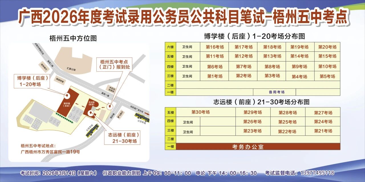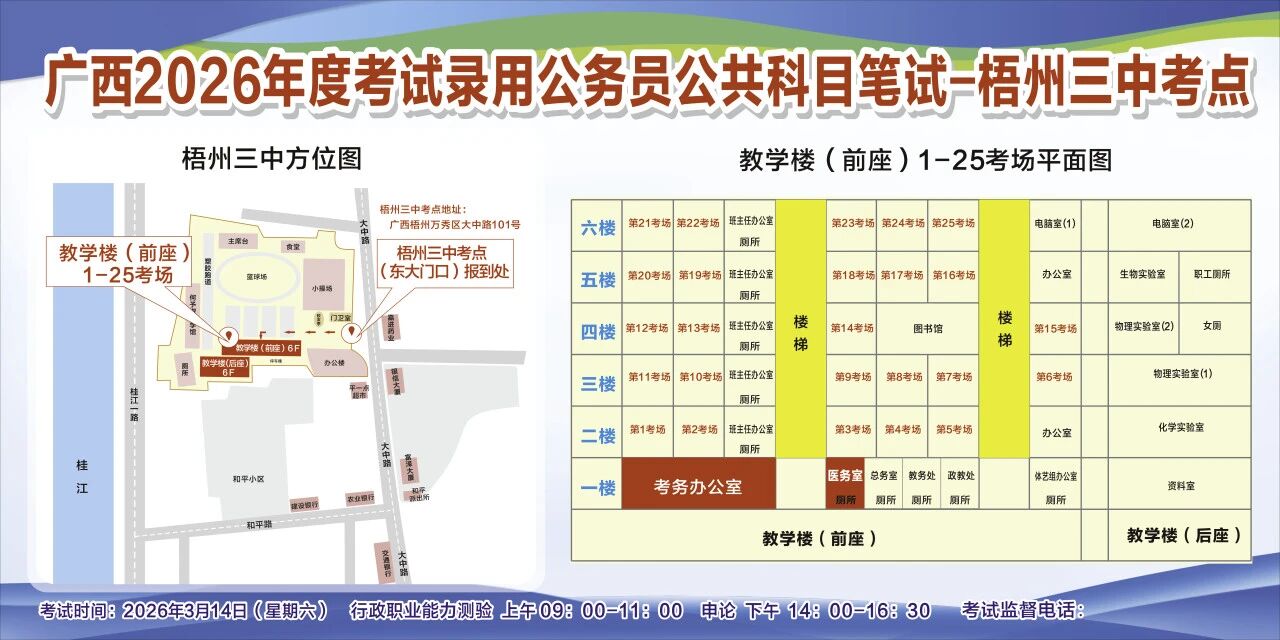 一、廣西2026年度考試錄用公務(wù)員(選調(diào)生)公共科目筆試將于3月14日舉行,梧州考區(qū)共設(shè)置10個(gè)考點(diǎn),請(qǐng)考生提前熟悉各自考點(diǎn)位置、周邊環(huán)境及交通情況,考試當(dāng)天提前出門做好準(zhǔn)備,準(zhǔn)時(shí)參加考試。